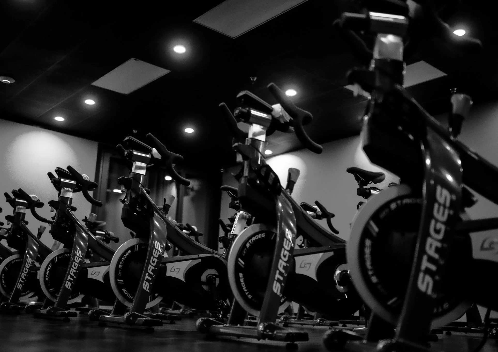 Row of indoor cycle machines neatly arranged in the class. Fitness studio, ready for spin class.